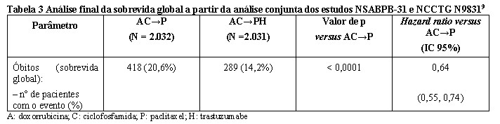 A análise final de SG a partir da análise conjunta dos estudos NSABPB-31 e NCCTG N9831 foi resumida na Tabela 3 a seguir.