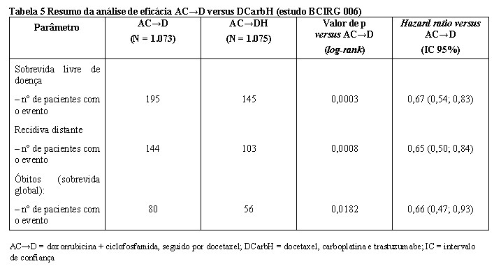 No estudo BCIRG 006, para o endpoint primário, sobrevida livre de doença, o hazard ratio transforma-se em um benefício absoluto, em termos de taxa de sobrevida livre de doença durante três anos, de 5,8 pontos percentuais (86,7% versus 80,9%) favoráveis ao braço de AC→DH (trastuzumabe) e 4,6 pontos percentuais (85,5%versus 80,9%) favoráveis ao braço de DCarbH (trastuzumabe) comparados a AC→D.
