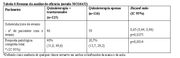 Os resultados de eficácia do estudo MO16432 estão resumidos na tabela a seguir. A mediana de duração do acompanhamento no braço de trastuzumabe foi 3,8 anos.