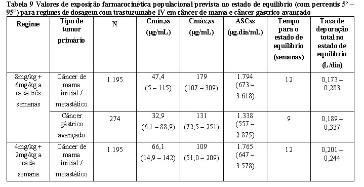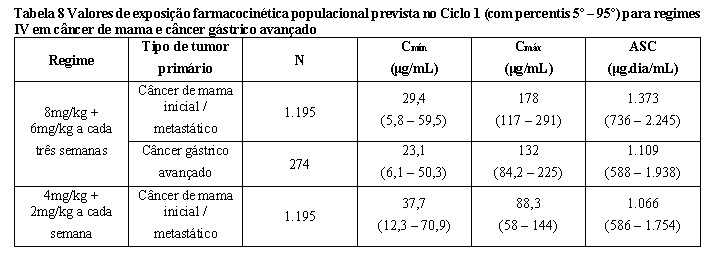 Os valores das exposições de farmacocinética populacional previstos (com percentis 5° - 95°) e do parâmetro farmacocinético em concentrações clinicamente relevantes (Cmáx e Cmín) para câncer de mama e câncer gástrico avançado tratados com os regimes semanal ou a cada três semanas estão descritos nas tabelas a seguir.