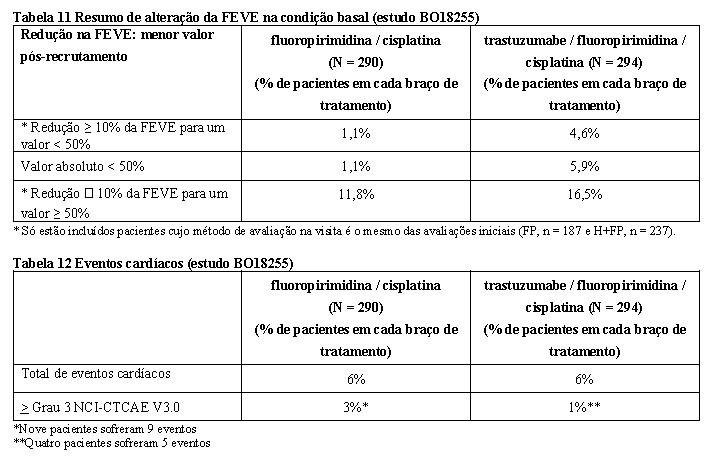 Os resultados de eficácia do estudo BO18255 estão resumidos na Tabela 7. Os pacientes com adenocarcinoma localmente avançado inoperável ou metastático e/ou recorrente do estômago ou da junção gastroesofágica, HER2-positivo sem possibilidade de terapia curativa e não tratados previamente foram recrutados para o estudo. O endpoint primário foi a sobrevida global, a qual foi definida como o tempo a partir da data de randomização até o dia do óbito por qualquer causa.