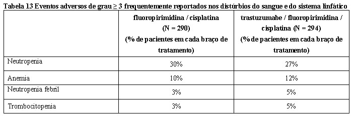 Análises de subgrupo post-hoc indicam que ter como alvo tumores com níveis mais elevados da proteína HER2 (IHQ 2+/FISH+ e IHQ 3+/independentemente do status FISH) resulta em melhor efeito terapêutico. A mediana de sobrevida global para o grupo com alta expressão de HER2 foi de 11,8 meses versus 16 meses, HR 0,65 (IC 95% 0,51-0,83), e a mediana de sobrevida livre de progressão foi de 5,5 meses versus 7,6 meses, HR 0,64 (IC 95% 0,51-0,79) para capecitabina/5-FU e cisplatina e trastuzumabe + capecitabina/5-FU e cisplatina, respectivamente.6