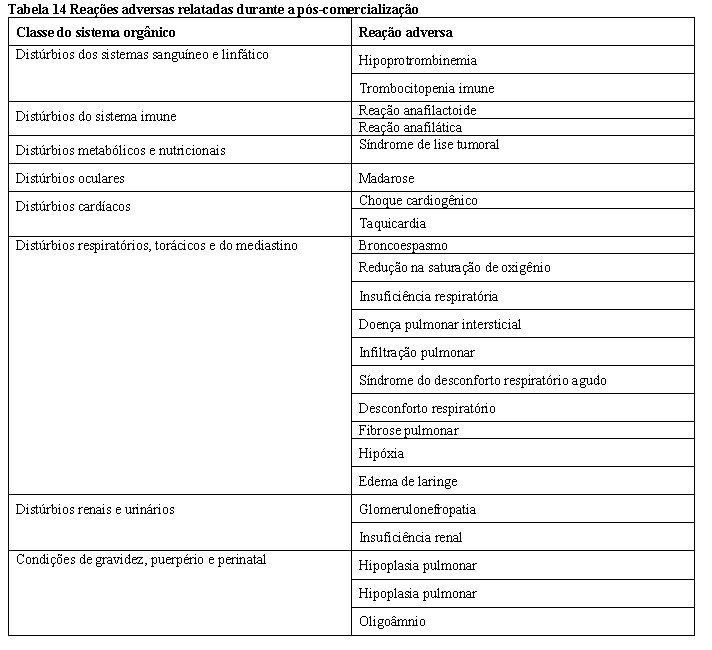 ocasionalmente resultaram em óbito e podem ocorrer como parte da reação relacionada à infusão ou serem de início tardio. Além disso, foram relatados casos de doença pulmonar intersticial, incluindo infiltrado pulmonar, síndrome do desconforto respiratório agudo, pneumonia, pneumonite, derrame pleural, dificuldade respiratória, edema pulmonar agudo e insuficiência respiratória.