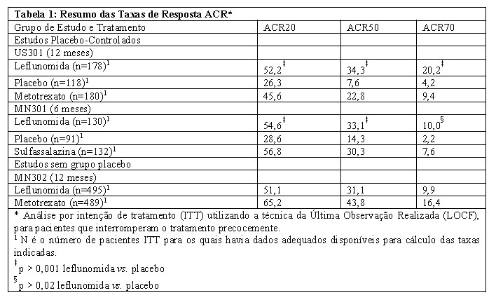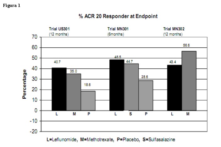 O estudo MN301, um estudo placebo-controlado, randomizou 358 pacientes com AR ativa para receber 20 mg/dia de leflunomida (n = 133), 2,0 g/dia de sulfassalazina (n = 133) ou placebo (n = 92). A duração do tratamento foi de 24 semanas. Uma extensão do estudo foi uma continuação opcional do estudo MN301, sem o grupo placebo, resultando em uma comparação de 12 meses de leflunomida e sulfassalazina (estudo MN303).