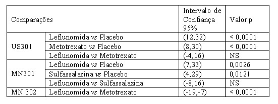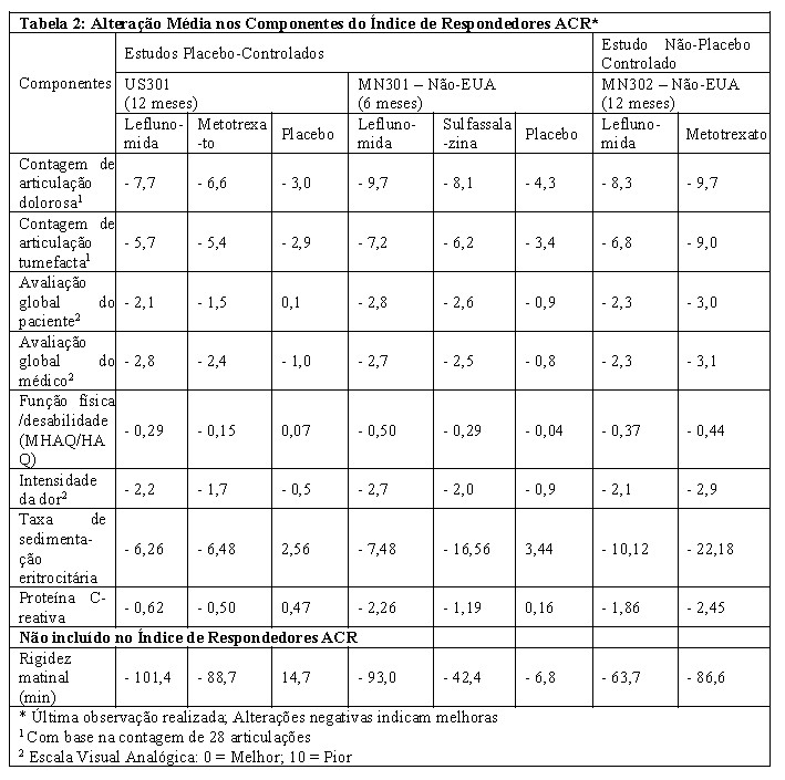 A Tabela 2 apresenta os resultados dos componentes dos critérios de resposta ACR para os estudos US301, MN301 e MN302. O tratamento com Leflun® foi significativamente superior ao placebo em todos os componentes dos critérios de resposta ACR nos estudos US301 e MN301. Além disso, o tratamento com Leflun® foi significativamente superior ao placebo na melhora da rigidez matinal, um indicador da atividade de AR, não incluída nos critérios de resposta ACR. Não foram demonstradas diferenças consistentes entre o tratamento com Leflun® e os comparadores ativos.
