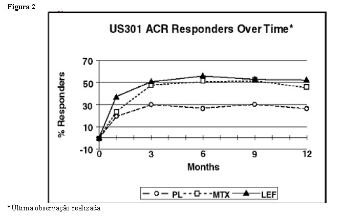 por 12 meses adicionais, em tratamento duplo-cego (período total de 2 anos de tratamento) nos estudos US301, MN305 e MN304. As taxas de Respondedores ACR nos 12 meses foram mantidas ao longo de 2 anos na maioria dos pacientes que continuaram com um segundo ano de tratamento. A melhora a partir do baseline nos componentes individuais dos critérios de resposta ACR também foi mantida na maioria dos pacientes durante o segundo ano do tratamento com Leflun®, em todos os três estudos.