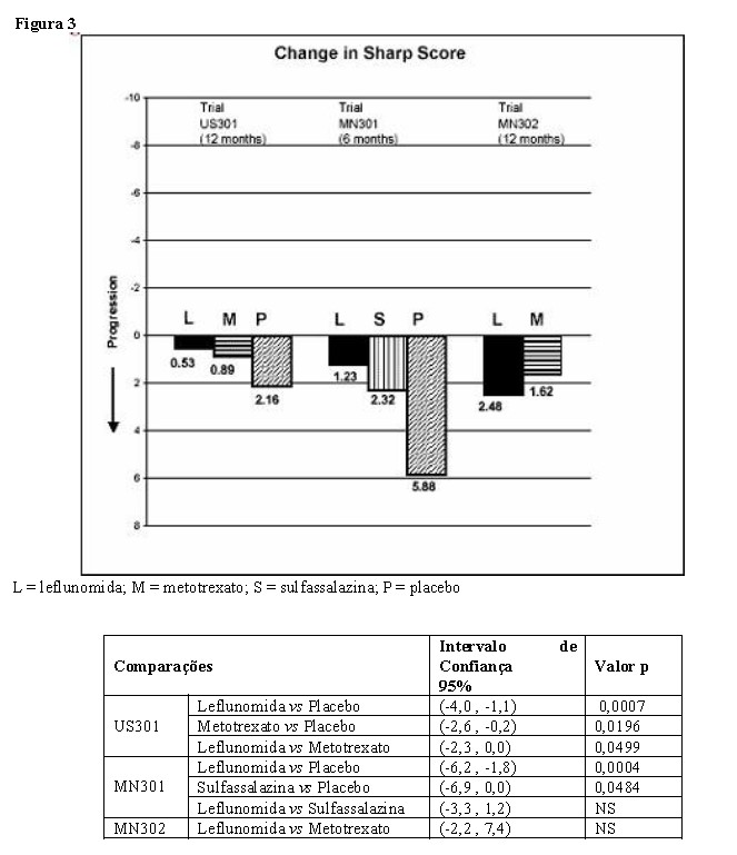 A alteração na progressão da doença estrutural, a partir da linha basal até o desfecho, conforme medida pelo escore Sharp de raio-X, é apresentada na Figura 3. Estatisticamente, o estudo com Leflun® foi significativamente superior ao placebo na inibição da progressão da doença pelo escore de Sharp. Não foram demonstradas diferenças consistentes entre a leflunomida e o metotrexato, ou entre a leflunomida e a sulfassalazina.