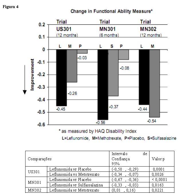 A melhora na função física foi avaliada utilizando o Questionário de Avaliação de Saúde (HAQ) e o Formulário resumido de resultados médicos (SF-36). O questionário HAQ avalia a função física de um paciente e o grau de desabilidade. A alteração média na habilidade funcional, a partir da linha basal, medida pelo Índice de Desabilidade HAQ (HAQ DI), nos estudos placebo e ativo controlado de 6 e 12 meses é apresentada na Figura 4. Estatisticamente, o tratamento com Leflun® foi significativamente superior ao placebo na melhora da função física. A superioridade em relação ao placebo foi demonstrada consistentemente em todas as oito subescalas HAQ D1 (ações de vestir, levantar-se, comer, andar, higiene, extensão do braço, ato de segurar e atividades) em ambos os estudos placebo-controlados.