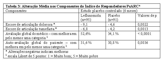 No grupo da leflunomida, dos pacientes totalmente analisáveis (n=186), 59,0% apresentaram uma melhora nos Critérios de Resposta ao Tratamento de Artrite Psoriática (PsARC), tratando-se do desfecho primário, comparada a 29,7% no grupo recebendo placebo (p < 0,0001). O PsARC é uma medida que combina uma avaliação global realizada pelo médico, uma autoavaliação global realizada pelo paciente, um escore de articulação dolorosa e um escore de articulação tumefacta. A melhora no PsARC é definida como uma diminuição ≥ 30% nos escores de articulações e ≥ 1 ponto nas avaliações globais.