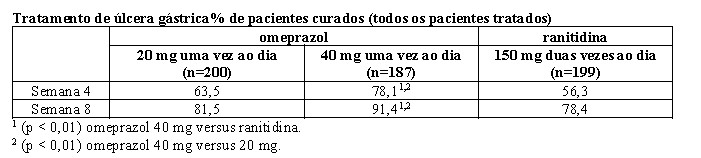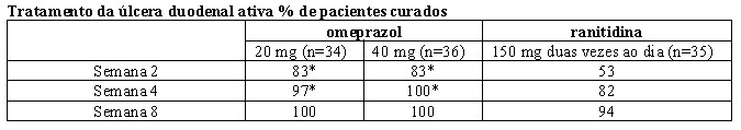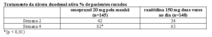 Em um estudo multicêntrico, duplo-cego, de 293 pacientes com úlcera duodenal endoscopicamente documentada, a porcentagem de pacientes curados (por protocolo) em 4 semanas foi significativamente maior com omeprazol 20 mg uma vez ao dia do que com ranitidina 150 mg duas vezes ao dia (p < 0,01).