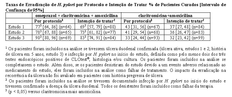 Três estudos clínicos randomizados, duplo-cegos, em pacientes com infecção por H. pylori e doença ulcerosa duodenal (n = 558) compararam omeprazol, claritromicina e amoxicilina com claritromicina e amoxicilina. Dois estudos (1 e 2) foram realizados em pacientes com úlcera duodenal ativa, e o outro estudo (3) foi realizado em pacientes com histórico de úlcera duodenal nos últimos 5 anos, mas sem úlcera presente no momento do estudo. O regime posológico nos estudos foi omeprazol 20 mg duas vezes ao dia mais claritromicina 500 mg duas vezes ao dia mais amoxicilina 1 g duas vezes ao dia por 10 dias; ou claritromicina 500 mg duas vezes ao dia mais amoxicilina 1 g duas vezes ao dia por 10 dias. Nos estudos 1 e 2, os pacientes que tomaram o regime de omeprazol também receberam 18 dias adicionais de omeprazol 20 mg uma vez ao dia. Os desfechos estudados foram a erradicação do H. pylori e a cura da úlcera duodenal (estudos 1 e 2 apenas). O status do H. pylori foi determinado pelo CLOtest®, histologia e cultura nos três estudos. Para um determinado paciente, H. Pylori foi considerado erradicado se pelo menos dois desses testes fossem negativos, e nenhum fosse positivo.