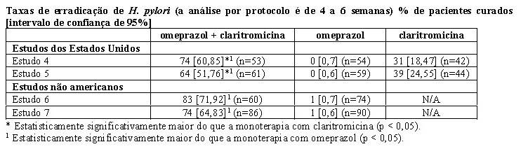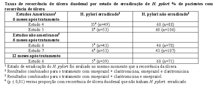 Quatro estudos randomizados, duplo-cegos, multicêntricos (4, 5, 6 e 7) avaliaram omeprazol 40 mg uma vez ao dia mais claritromicina 500 mg três vezes ao dia por 14 dias, seguido por omeprazol 20 mg uma vez ao dia, (Estudos 4, 5 e 7) ou por omeprazol 40 mg uma vez ao dia (Estudo 6) por mais 14 dias em pacientes com úlcera duodenal ativa associada a H. pylori. Os estudos 4 e 5 foram conduzidos nos Estados Unidos e no Canadá e incluíram 242 e 256 pacientes, respectivamente. Infecção por H. pylori e úlcera duodenal foram confirmadas em 219 pacientes no Estudo 4 e 228 pacientes no Estudo 5. Esses estudos compararam o regime de combinação com monoterapias de omeprazol e claritromicina. Os estudos 6 e 7 foram realizados na Europa e envolveram 154 e 215 pacientes, respectivamente. Infecção por H. pylori e úlcera duodenal foram confirmadas em 148 pacientes no Estudo 6 e 208 pacientes no Estudo 7. Esses estudos compararam o regime de combinação com a monoterapia com omeprazol. Os resultados das análises de eficácia para estes estudos são descritos abaixo. A erradicação do H. pylori foi definida como ausência de teste positivo (cultura ou histologia) em 4 semanas após o término do tratamento, e dois testes negativos foram necessários para serem considerados erradicados de H. pylori. Na análise por protocolo, os seguintes pacientes foram excluídos: desistentes, pacientes sem resultados dos testes clínicos para H. pylori pós-tratamento, e pacientes que não foram avaliados para erradicação de H. pylori porque tinham úlcera ao final do tratamento.