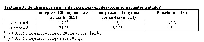 Num estudo multicêntrico, duplo-cego, dos EUA, de 40 mg de omeprazol uma vez ao dia, 20 mg uma vez ao dia, e placebo em 520 pacientes com úlcera gástrica diagnosticada endoscopicamente, os seguintes resultados foram obtidos.
