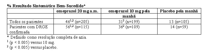 Neste e em outros cinco estudos de DRGE controlados, significativamente mais pacientes que tomaram 20 mg de omeprazol (84%) relataram alívio completo dos sintomas de DRGE do que os pacientes que receberam placebo (12%).