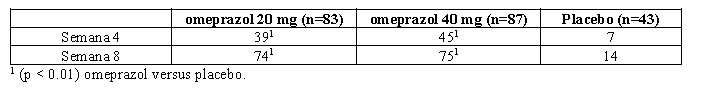 Em um estudo multicêntrico, duplo-cego, controlado com placebo, de 20 mg ou 40 mg de cápsulas de liberação retardada de omeprazol em pacientes com sintomas de DRGE e EE diagnosticado com endoscopia de grau 2 ou acima, as porcentagens de cura (por protocolo) foram as seguintes: