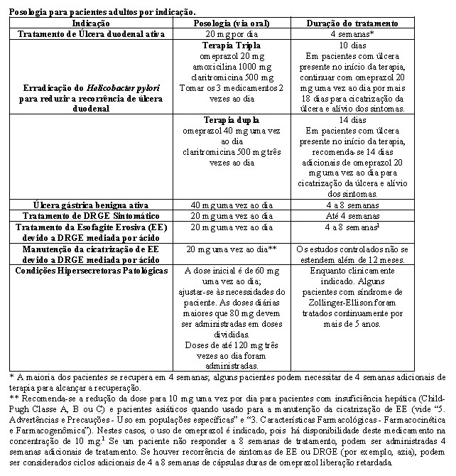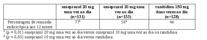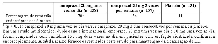 Em um estudo duplo-cego, randomizado, multicêntrico, placebo controlado, dois esquemas de doses de omeprazol foram estudados em pacientes com esofagite cicatrizada endoscopicamente confirmada. Os resultados para determinar a manutenção da cura de EE são descritos na tabela a seguir.