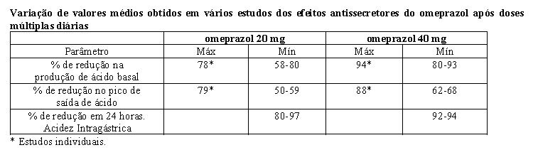 Os resultados de numerosos estudos do efeito antissecretório de doses múltiplas de 20 mg e 40 mg de omeprazol em indivíduos saudáveis e pacientes são mostrados abaixo. O valor "máx." representa determinações em um momento de efeito máximo (2 a 6 horas após a posologia), enquanto valores "mín" são aquelas 24 horas após a última dose de omeprazol.