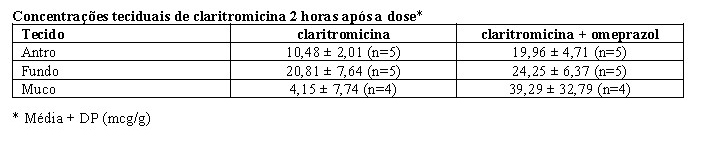 As concentrações plasmáticas de claritromicina e 14-hidroxi-claritromicina foram aumentadas pela administração concomitante de omeprazol. Para a claritromicina, a Cmáx média foi 10% maior, a Cmín média foi 27% maior e a ASC0-8 média foi 15% maior quando a claritromicina foi administrada com omeprazol do que quando a claritromicina foi administrada isoladamente. Resultados semelhantes foram observados para 14-hidroxi-claritromicina, a Cmáx média foi 45% maior, a Cmín média foi 57% maior e a ASC0-8 média foi 45% maior. As concentrações de claritromicina no tecido gástrico e no muco também foram aumentadas pela administração concomitante de omeprazol.