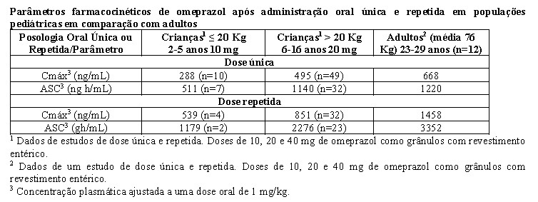 Após doses comparáveis de mg/kg de omeprazol, as crianças mais jovens (2 a 5 anos de idade) têm ASCs mais baixas do que as crianças dos 6 aos 16 anos de idade ou adultos; As ASCs dos dois últimos grupos não diferiram (vide "8. Posologia e Modo de Usar").