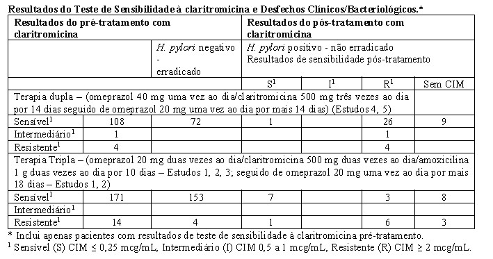 As taxas de resistência pré-tratamento com claritromicina foram de 3,5% (4/113) nos estudos de terapia dupla com omeprazol/claritromicina (4 e 5) e 9,3% (41/439) nos estudos de terapia tripla com omeprazol/claritromicina/amoxicilina (1, 2 e 3).