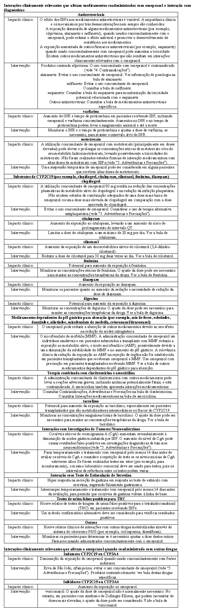 A administração concomitante de omeprazol e voriconazol (um inibidor combinado de CYP2C19 e CYP3A4) resultou em mais do que o dobro da exposição ao omeprazol. Quando o voriconazol (400 mg a cada 12 horas durante um dia, seguido de 200 mg uma vez ao dia durante 6 dias) foi administrado com omeprazol (40 mg uma vez por dia durante 7 dias) a indivíduos saudáveis, o estado estacionário Cmáx e ASC0-24 de omeprazol aumentou significativamente em média de 2 vezes (IC de 90%: 1,8 e 2,6) e 4 vezes (IC de 90%: 3,3 e 4,4), respectivamente, quando comparado ao omeprazol sem voriconazol (vide "6. Interações Medicamentosas").