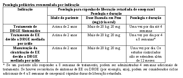 A eficácia do omeprazol no tratamento da DRGE sintomático em pacientes pediátricos acima de 2 anos de idade baseia-se, em parte, em dados obtidos de pacientes pediátricos num estudo clínico não controlado. O estudo envolveu 113 pacientes pediátricos de 2 a 16 anos de idade com um histórico de sintomas sugestivos de DRGE sintomático. Aos pacientes foi administrada uma dose única de omeprazol (10 mg ou 20 mg, com base no peso corporal) durante 4 semanas. Resposta bem-sucedida foi definida como ausência de episódios moderados ou graves de sintomas relacionados à dor, ou vômito/regurgitação durante os últimos 4 dias de tratamento. Os resultados mostraram taxas de sucesso de 60% (9/15; 10 mg de omeprazol) e 59% (58/98; 20 mg de omeprazol), respectivamente.