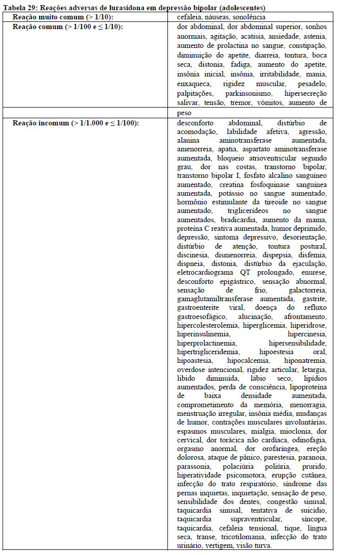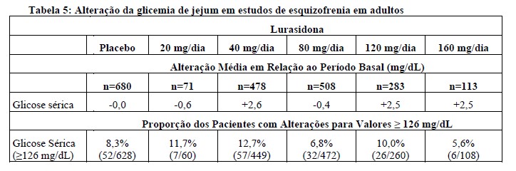 As alterações na glicemia foram semelhantes nos estudos clínicos conduzidos com pacientes pediátricos (13-17 anos) e adultos com depressão bipolar. No estudo de 6 semanas e controlado por placebo em pacientes pediátricos, a alteração média da glicemia de jejum foi de +2,2 mg/mL para lurasidona 20 a 80 mg/dia (n=114) e -0,7 mg/dL para placebo (n=114).
