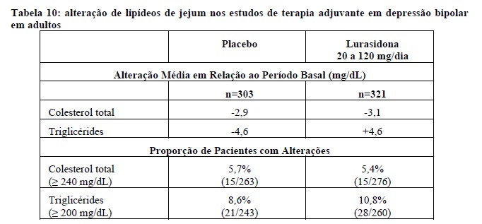 No estudo não controlado, aberto e de prazo mais longo em depressão bipolar, os pacientes que receberam lurasidona, em terapia adjuvante com lítio ou valproato no estudo de curto prazo e continuaram no estudo de prazo mais longo, apresentaram alteração média de colesterol total e triglicérides de -0,9 (n=88) e +5,3 (n=88) mg/dL na Semana 24, respectivamente.