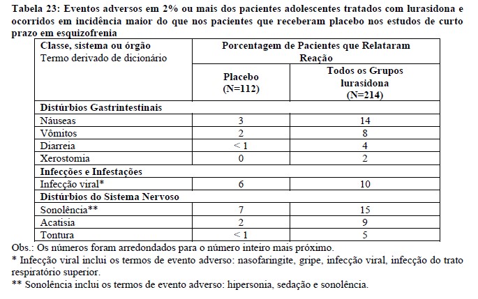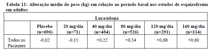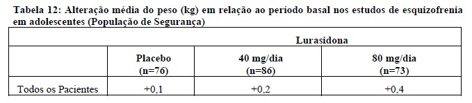 Dados do estudo de curto prazo, controlado por placebo em adolescentes com esquizofrenia são apresentados na Tabela 12. O ganho de peso médio foi de +0,3 kg (0,2 kg para 40 mg e 0,4 kg para 80 mg) nos pacientes tratados com lurasidona em comparação a +0,1 kg nos pacientes que receberam placebo. A proporção de pacientes com aumento de peso corpóreo ≥ 7% (no Desfecho) foi de 2,5% nos pacientes tratados com lurasidona (3,5% para 40 mg e 1,4% para 80 mg) versus 2,7% nos pacientes que receberam placebo.