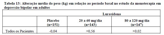Os dados do estudo de curto prazo, de dose flexível, controlado por placebo, de monoterapia em depressão bipolar são apresentados na Tabela 13. O ganho de peso médio foi de +0,29 kg nos pacientes tratados com lurasidona em comparação a -0,04 kg nos pacientes que receberam placebo. A proporção de pacientes com aumento de peso corpóreo ≥ 7% (no Desfecho) foi de 2,4% nos pacientes tratados com lurasidona versus 0,7% nos pacientes que receberam placebo.