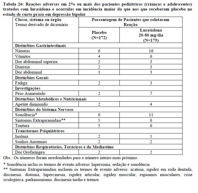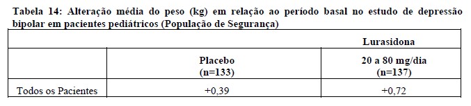 Os dados do estudo de 6 semanas, controlado por placebo, de depressão bipolar em pacientes pediátricos (13-17 anos) são apresentados na Tabela 14. O ganho de peso médio foi de +0,72 kg nos pacientes tratados com lurasidona em comparação a +0,39 kg nos pacientes que receberam placebo. A proporção de pacientes com aumento do peso corpóreo ≥ 7% (no Desfecho) foi de 2,9% nos pacientes tratados com lurasidona versus 4,5% para os pacientes que receberam placebo.