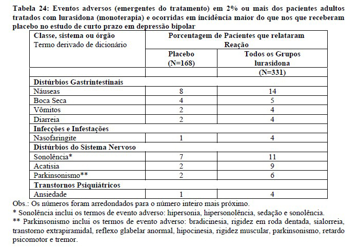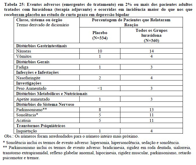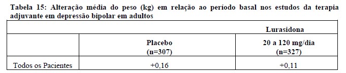 Os dados dos estudos de curto prazo, de dose flexível, controlados por placebo, da terapia adjuvante em depressão bipolar são apresentados na Tabela 15. O ganho de peso médio foi de +0,11 kg nos pacientes tratados com lurasidona em comparação a +0,16 kg nos que receberam placebo. A proporção de pacientes com aumento ≥ 7% do peso corpóreo (no Desfecho) foi de 3,1% nos pacientes tratados com lurasidona versus 0,3% nos que receberam placebo.