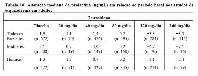 Nos estudos de curto prazo e controlados por placebo em esquizofrenia, a alteração mediana do Período Basal ao desfecho nos níveis de prolactina nos pacientes tratados com lurasidona foi de +0,4 ng/mL e -1,9 ng/mL nos pacientes que receberam placebo. A alteração mediana do Período Basal ao desfecho em homens foi de +0,5 ng/mL e em mulheres, de -0,2 ng/mL para os pacientes tratados com lurasidona. As alterações medianas da prolactina por dose são mostradas na Tabela 16.