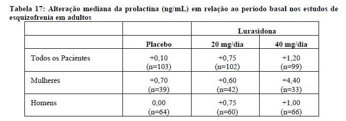 No estudo de curto prazo e controlado por placebo em esquizofrenia em adolescentes, a alteração mediana do Período Basal ao desfecho nos níveis de prolactina nos pacientes tratados com lurasidona foi de +1,1 ng/mL e +0,1 ng/mL nos pacientes que receberam placebo. A alteração mediana do Período Basal ao desfecho em homens foi de +1,0 ng/mL e em mulheres, de +2,6 ng/mL para os pacientes tratados com lurasidona. As alterações medianas da prolactina por dose são mostradas na Tabela 17.