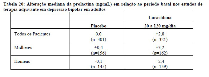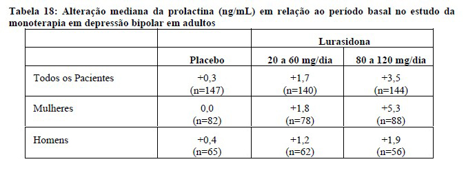 A alteração mediana do Período Basal ao desfecho nos níveis de prolactina, no estudo de curto prazo, de dose flexível, controlado por placebo, da monoterapia em depressão bipolar, foi de +1,7 ng/mL e +3,5 ng/mL com lurasidona 20 a 60 mg/dia e 80 a 120 mg/dia, respectivamente, em comparação a +0,3 ng/mL com os pacientes que receberam o placebo. A alteração mediana do Período Basal ao desfecho em homens foi de +1,5 ng/mL e em mulheres, de +3,1 ng/mL. As alterações medianas da prolactina por intervalo de dose são mostradas na Tabela 18.