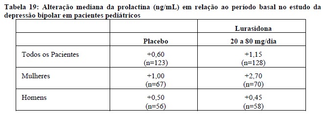 A alteração mediana do Período Basal ao desfecho nos níveis de prolactina, no estudo de 6 semanas, controlado por placebo, da depressão bipolar em pacientes pediátricos, foi de +1,15 ng/mL nos pacientes tratados com lurasidona em comparação a +0,60 ng/mL nos pacientes que receberam placebo. A alteração mediana do Período Basal ao desfecho em homens foi de +0,45 ng/mL e em mulheres, de +2,70 ng/mL. As alterações medianas da prolactina por intervalo de dose são mostradas na Tabela 19.