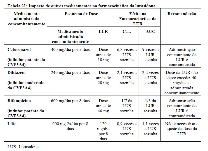 Metabolismo e Eliminação: A lurasidona é metabolizada principalmente pela CYP3A4. As principais vias de biotransformação são a N-desalquilação oxidativa, a hidroxilação do anel norbornano e a S-oxidação. A lurasidona é metabolizada em dois metabólitos ativos (ID-14283 e ID-14326) e dois metabólitos não ativos principais (ID-20219 e ID- 20220).