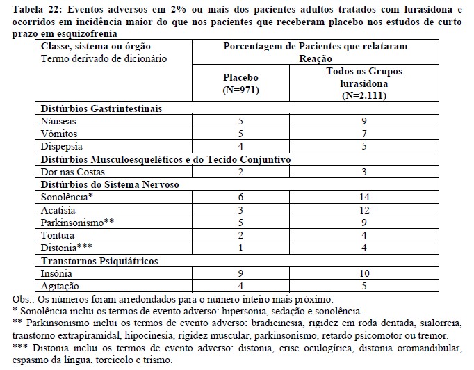 A lurasidona foi superior ao placebo na redução da pontuação PANSS e CGI-S em ambos os grupos (40 mg e 80 mg ao dia); em média, a dose de 80 mg/dia não apresentou benefícios adicionais quando comparada com a dose de 40 mg/dia. Os resultados dos desfechos primários e secundário chave de eficácia desse estudo são apresentados na Tabela 2.