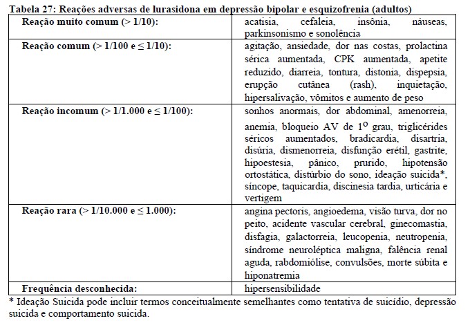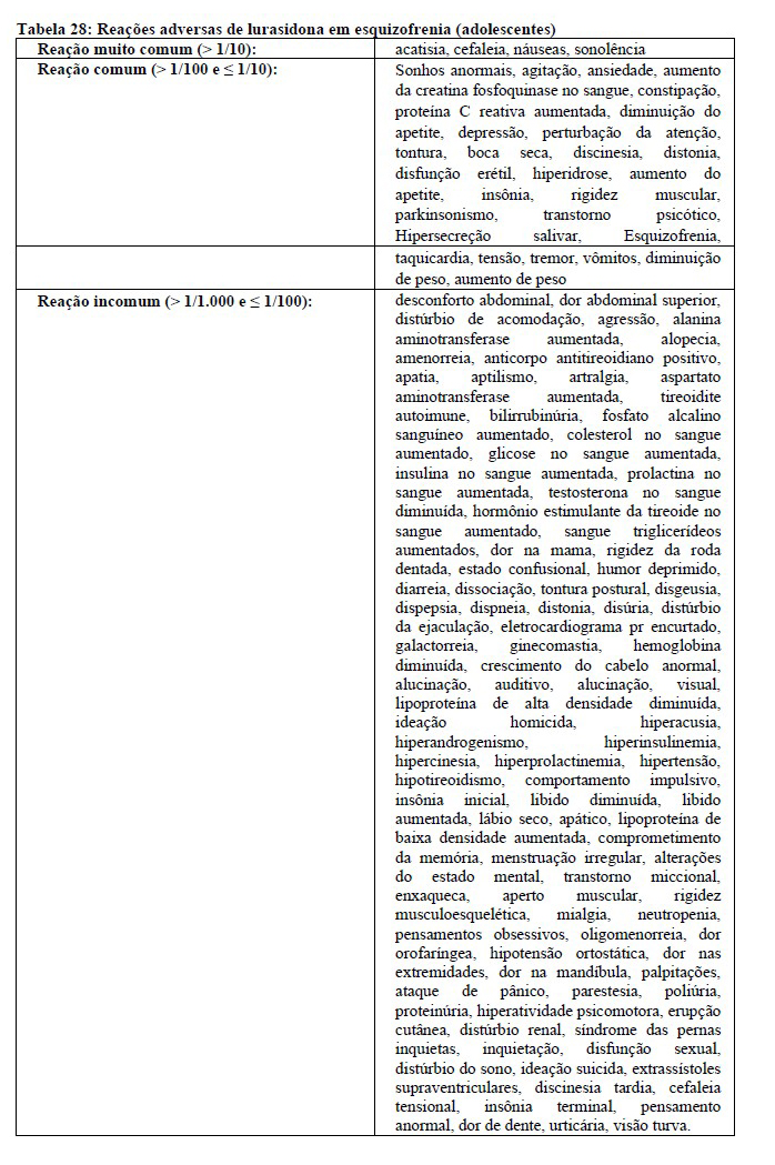 A proporção de pacientes com elevações da prolactina ≥ 5x o limite superior da normalidade (LSN) foi de 0,4% nos pacientes tratados com lurasidona versus 0,0% nos pacientes que receberam placebo. A proporção de mulheres com elevações da prolactina ≥ 5x LSN foi de 0,6% nas tratadas com lurasidona versus 0% nas que receberam placebo. A proporção de homens com elevações da prolactina ≥ 5x LSN foi de 0% versus 0% nos que receberam placebo.