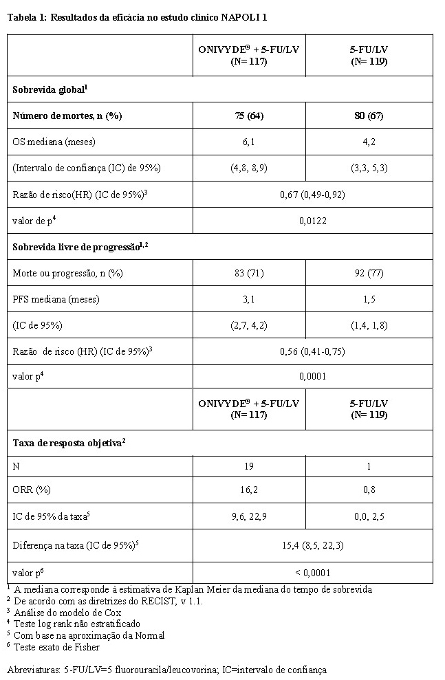 A segurança e a eficácia de ONIVYDE® foram investigadas em um estudo clínico multinacional, randomizado, aberto e controlado (NAPOLI-1) que testou dois regimes de tratamento para pacientes com adenocarcinoma pancreático metastático com progressão documentada da doença após tratamento com gencitabina ou esquema quimioterápico contendo gencitabina. O estudo foi desenhado para avaliar a eficácia clínica e a segurança de ONIVYDE® em monoterapia ou ONIVYDE® +5-FU/LV em comparação com um braço controle ativo de 5-FU/LV.