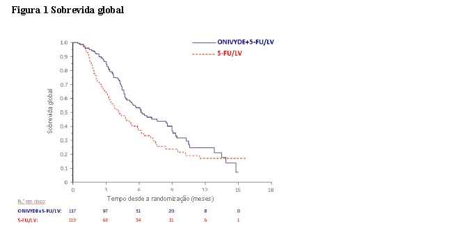 Os pacientes randomizados para ONIVYDE® +5-FU/LV receberam ONIVYDE® (70 mg/m2) através de infusão intravenosa durante 90 minutos, seguido por LV 400 mg/m2 por via intravenosa durante 30 minutos, seguido por 5-FU 2.400 mg/m2 por via intravenosa durante 46 horas, administrados a cada 2 semanas. Os pacientes homozigóticos para o alelo UGT1A1*28 receberam uma dose inicial mais baixa de ONIVYDE® (ver item 8. POSOLOGIA E MODO DE USAR). Os pacientes randomizados para 5-FU/LV receberam leucovorina 200 mg/m2 por via intravenosa durante 30 minutos, seguido por 5-FU 2.000 mg/m2 por via intravenosa durante 24 horas, administrados nos dias 1, 8, 15 e 22 de um ciclo de 6 semanas. Os pacientes randomizados para monoterapia com ONIVYDE® receberam 100 mg/m2 através infusão intravenosa durante 90 minutos a cada 3 semanas.