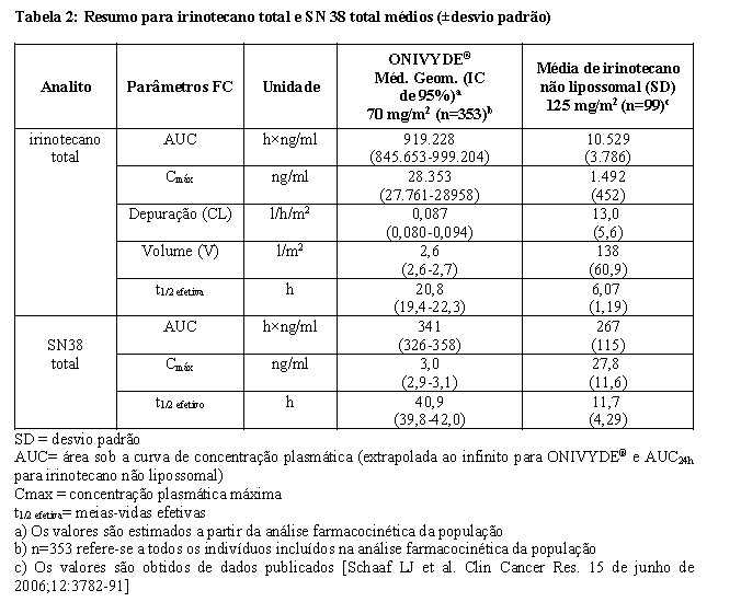 A farmacocinética plasmática do irinotecano total e SN-38 total foi avaliada em pacientes com câncer que receberam ONIVYDE®, como agente único ou como parte de quimioterapia combinada, em doses entre 50 e 155 mg/m2. Os parâmetros farmacocinéticos do irinotecano total e do SN-38, após a administração de ONIVYDE® 70 mg/m2 são apresentados na Tabela 2.