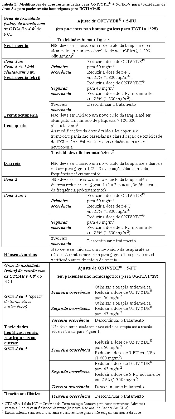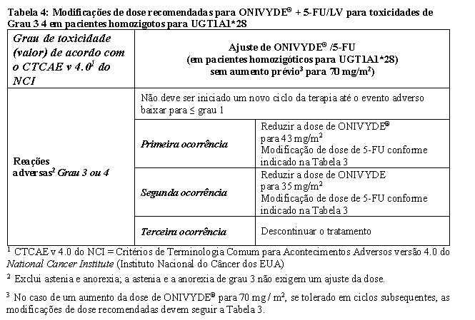 Todas as modificações de dose devem ser baseadas na pior toxicidade precedente. A dose de LV não requer ajuste. Para toxicidades de Grau 1 e 2, não há recomendações de modificação de dose. Os ajustes de dose, conforme resumidos na Tabela 3 e na Tabela 4, são recomendados para controlar as toxicidades de Grau 3 ou 4 relacionadas ao ONIVYDE®.