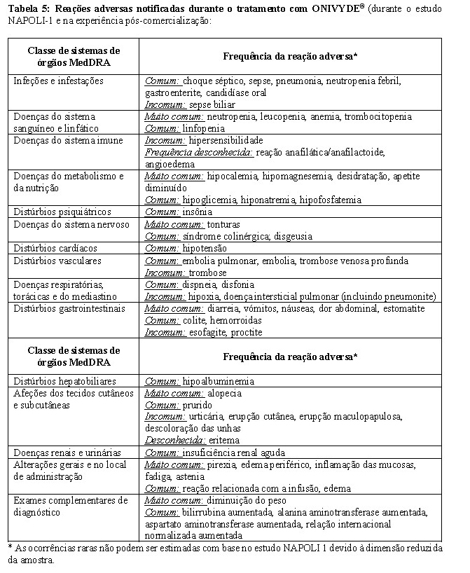 As reações adversas que podem ocorrer durante o tratamento com ONIVYDE® estão resumidas abaixo e são apresentadas por classe de sistema de órgãos e categoria de frequência (Tabela 5). Dentro de cada classe de sistema de órgãos e categoria de frequência, as reações adversas são apresentadas em ordem decrescente de gravidade. Dentro de cada classe de sistemas de órgãos e categoria de frequência, as reações adversas são apresentadas por ordem decrescente de gravidade. As categorias de frequência utilizadas para reações adversas são: muito comum (≥1/10); comum (≥1/100, < 1/10); incomum (≥1/1.000, < 1/100); raros (≥1/10.000, < 1/1.000)* e frequência desconhecida (a frequência não pode ser calculada a partir dos dados disponíveis).
