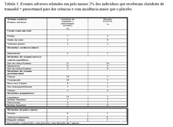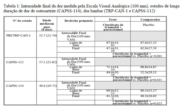Os comprimidos de cloridrato de tramadol + paracetamol (37,5 mg de cloridrato de tramadol/325 mg de paracetamol) foram avaliados em três estudos controlados por placebo, em 960 pacientes com osteoartrite do quadril e joelho, e dor lombar. Cada estudo controlado por placebo iniciou com um período de titulação de dose de aproximadamente 10 dias, seguidos por uma fase de manutenção com doses de 1 a 2 comprimidos (37,5 mg de tramadol/325 mg de paracetamol para 75 mg de tramadol/650 mg de paracetamol) a cada 4 a 6 horas, não excedendo o máximo de 8 comprimidos ao dia. Todos os três estudos tiveram uma duração de tratamento de 90 dias. A dose diária média de cloridrato de tramadol + paracetamol para os estudos controlados variou de 4,1 para 4,2 comprimidos.