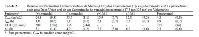 O tramadol é administrado sob a forma de racemato e tanto a forma (-) como a (+) do tramadol e do metabólito M1 são detectadas na circulação. A farmacocinética do tramadol e do paracetamol no plasma, após administração oral de um comprimido de cloridrato de tramadol + paracetamol é apresentada na Tabela 2. Embora o tramadol seja absorvido rapidamente após a administração, a sua absorção é mais lenta (e a meia-vida mais longa) quando comparado ao paracetamol. Após dose oral única da combinação de tramadol e paracetamol (37,5 mg/325,0 mg), concentrações plasmáticas de pico de 64,3 ng/mL / 55,5 ng/mL de (+) tramadol/(-) tramadol e 4,2 mcg/mL de paracetamol são alcançadas após 1,8 horas e 0,9 hora respectivamente. As meias-vidas de eliminação (t1/2) são 5,1 h / 4,7 h para (+) tramadol / (-) tramadol e 2,5 horas para o paracetamol. Estudos farmacocinéticos de dose única e múltipla realizados com cloridrato de tramadol + paracetamol em voluntários não mostraram interações medicamentosas significativas entre tramadol e paracetamol.