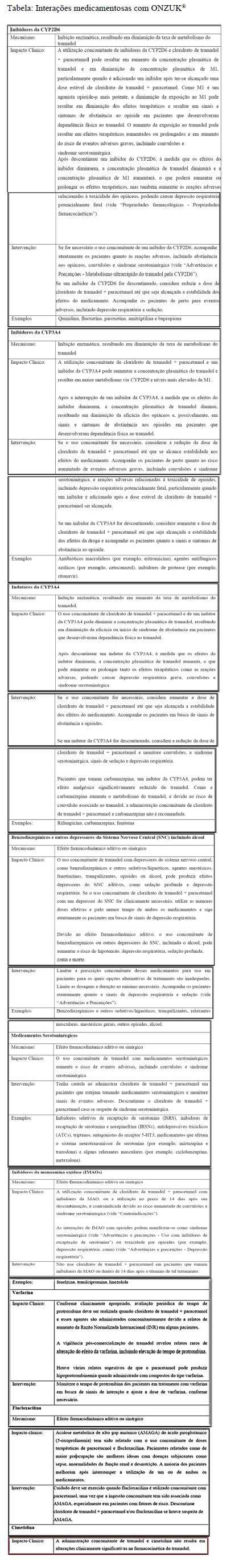 Com base em suas propriedades farmacodinâmicas e farmacocinéticas, o tramadol e o paracetamol exibem potencial para interações farmacodinâmicas e farmacocinéticas. Os vários tipos de interação, recomendações gerais associadas e listas de exemplos são descritos abaixo. Essas listas de exemplos não são abrangentes e, portanto, recomenda-se que a bula de cada medicamento coadministrado com ONZUK® seja consultada para informações relacionadas às vias de interação, riscos potenciais e ações específicas a serem tomadas com relação à coadministração.