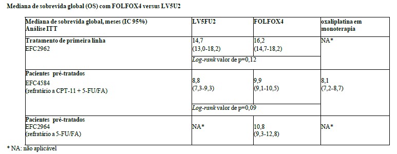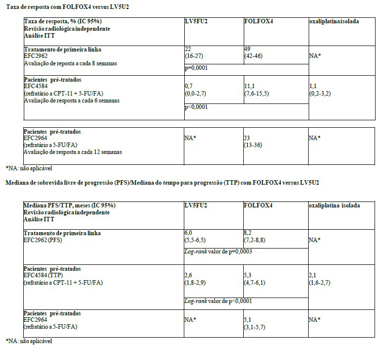 - em pacientes pré-tratados, no estudo de fase III EFC4584, comparativo, de 3 braços, randomizou 821 pacientes refratários ao tratamento com irinotecano (CPT-11) + combinação de 5-FU/FA, para receber 5-FU/FA isolado (LV5FU2, N=275), oxaliplatina como agente único (N=275) ou associação de oxaliplatina com 5-FU/FA (FOLFOX4, N=271);