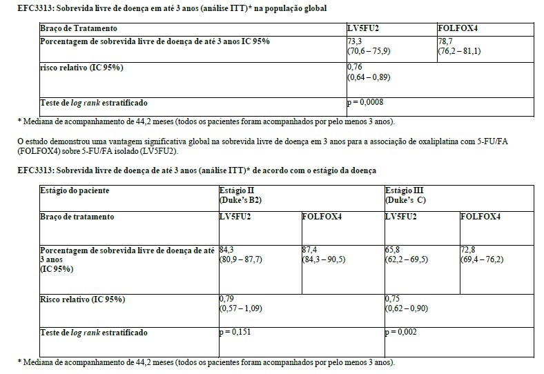 No cenário adjuvante, o estudo MOSAIC comparativo, de fase III (EFC3313), randomizou 2246 pacientes (899 estágio II/Duke's B2 e 1347 estágio III/ Duke's C) após ressecção completa do tumor primário do câncer de cólon para receber tanto 5-FU/FA isolado (LV5FU2, N=1123) (B2/C = 448/675) quanto a associação de oxaliplatina com 5-FU/FA (FOLFOX4, N=1123 (B2/C) = 451/672).