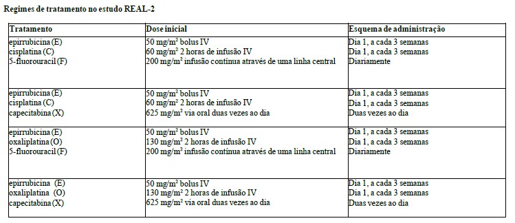 A análise primária de eficácia na população per-protocol demonstrou não-inferioridade na sobrevida global para os regimes baseados em capecitabina versus 5-FU (risco relativo: 0,86; IC 95%: 0,80-0,99) e para os regimes baseados em oxaliplatina versus cisplatina (risco relativo: 0,92; IC 95%: 0,80-1,10). A sobrevida global mediana foi de 10,9 meses nos regimes baseados em capecitabina e 9,6 meses em regimes baseados em 5- FU. A sobrevida global mediana foi de 10,0 meses em regimes baseados em cisplatina e 10,4 meses em regimes baseados em oxaliplatina. Sobrevidas mediana e de um ano foram maiores para o grupo EOX (epirrubicina, oxaliplatina e capecitabina) (46,8% e 11,2 meses; hazard ratio: 0,80; IC 95%: 0,66-0,97) em comparação ao grupo ECF (37,7% e 9,9 meses; p=0,02).